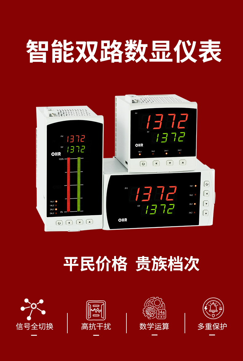 虹潤(rùn)公司是專業(yè)生產(chǎn)數(shù)顯表的國(guó)家專精特新“小巨人”企業(yè),生產(chǎn)的智能雙路數(shù)顯儀表,具有全切換信號(hào)輸入,加減乘除數(shù)學(xué)運(yùn)算,高抗干擾,過壓過流保護(hù),RS485/RS232通訊等特點(diǎn)。產(chǎn)品獲得巡回檢測(cè)顯示方法及裝置、儀表殼體等2項(xiàng)國(guó)家發(fā)明專利,主持起草工業(yè)過程控制系統(tǒng)用模擬輸入兩位或多位輸出儀表、物聯(lián)網(wǎng)智能溫度儀表通用技術(shù)條件等2項(xiàng)國(guó)家標(biāo)準(zhǔn),,以及通信系統(tǒng)多通道數(shù)據(jù)采集控制終端規(guī)范軍用標(biāo)準(zhǔn),參與國(guó)際5G標(biāo)準(zhǔn)制定,取得雙回路數(shù)字顯示控制儀表等3項(xiàng)相關(guān)軟件著作權(quán)。產(chǎn)品廣泛應(yīng)用于電力、石化、冶金、化工、造紙、食品、輕工、制藥、熱處理、水處理、機(jī)械配套等各種工業(yè)現(xiàn)場(chǎng)。