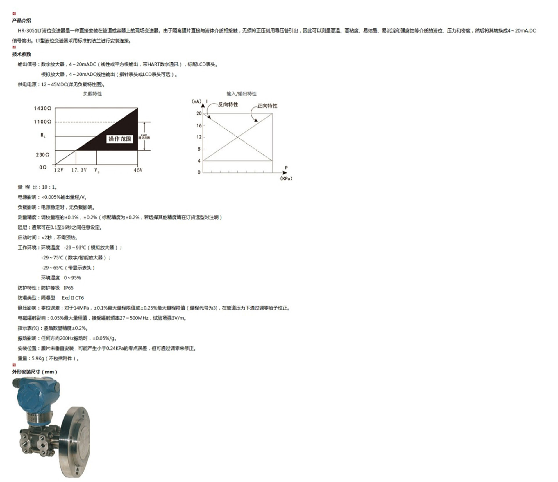 HR-3051LT液位變送器是一種直接安裝在管道或容器上的現(xiàn)場(chǎng)變送器。由于隔離膜片直接與液體介質(zhì)相接觸,無須將正壓側(cè)用導(dǎo)壓管引出,因此可以測(cè)量高溫、高粘度、易結(jié)晶、易沉淀和強(qiáng)腐蝕等介質(zhì)的液位、壓力和密度,然后將其轉(zhuǎn)換成4~20mA.DC信號(hào)輸出。